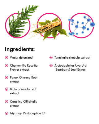 Composition of ingredients: deionized water, chamomilla recutita flower extract, panax ginseng root extract, biota orientalis leaf extract, terminalia chebula extract, arctostaphylos uva ursi (bearberry) leaf extract, corallina officinalis extract, and Myristoyl Pentapeptide 17